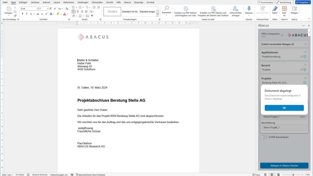 - Dokumente in Word erstellen und direkt im entsprechenden Kunden-, Mitarbeiter- oder Projektdossier ablegen
