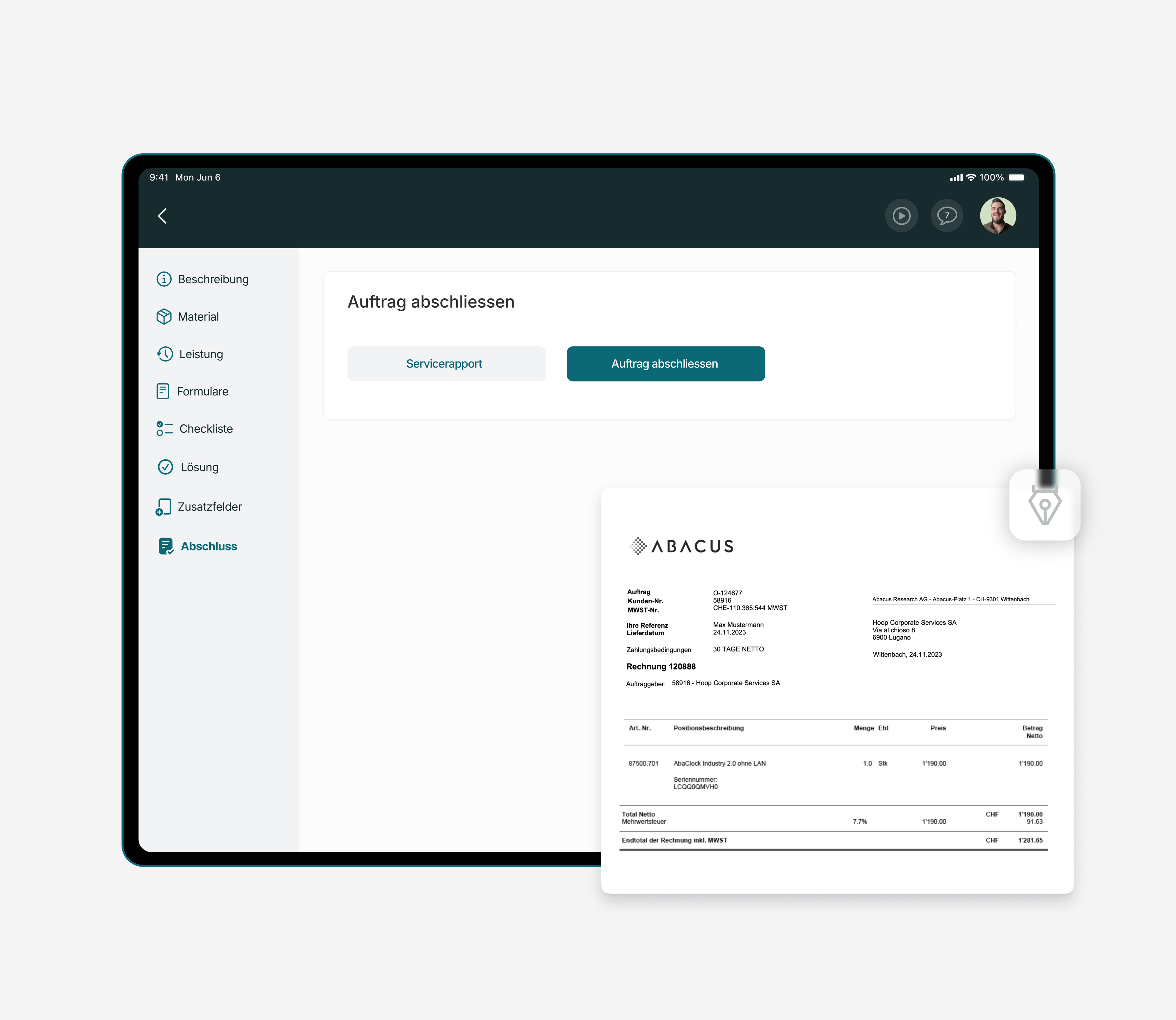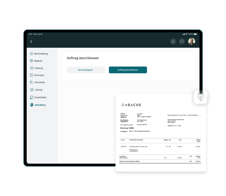 Abacus Intelligence unterstützt Servicetechniker dabei, ihre Leistungen präzise und professionell zu dokumentieren. Digitale Signaturen machen einen nahtlosen, modernen und papierlosen Abschluss direkt vor Ort beim Kunden möglich.