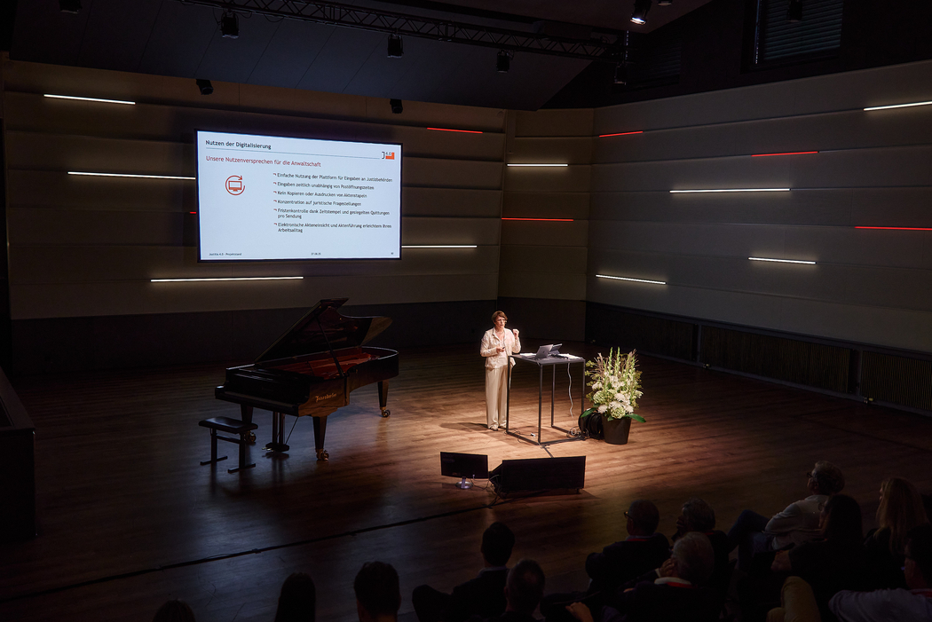 Lucia Eigensatz begeisterte mit ihrem Beitrag zum Projekt Justitia 4.0: Sie schilderte eindrücklich, wie die sichere digitale Justiz Realität wird und Papierberge bald der Vergangenheit angehören – damit der Zugang zum Recht künftig einfacher, schneller und barrierefrei möglich ist.