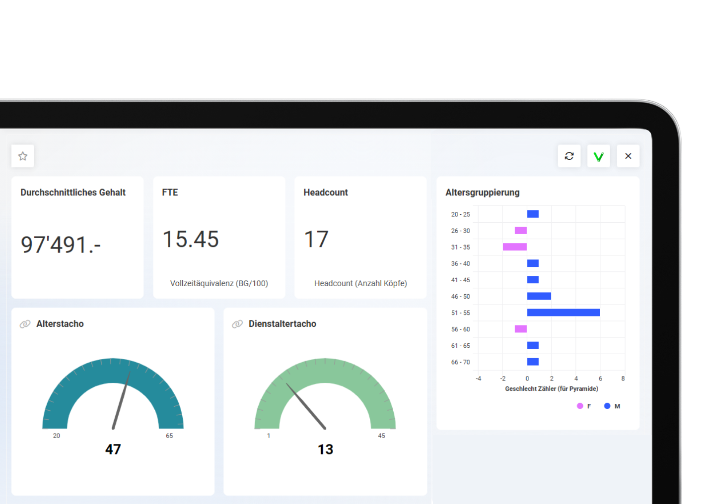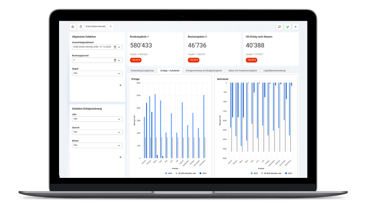 Alle Daten werden laufend aktualisiert und direkt aus der Abacus Software übernommen. So treffen Sie Entscheidungen immer auf Basis der aktuellsten Informationen und reagieren schneller auf Veränderungen.