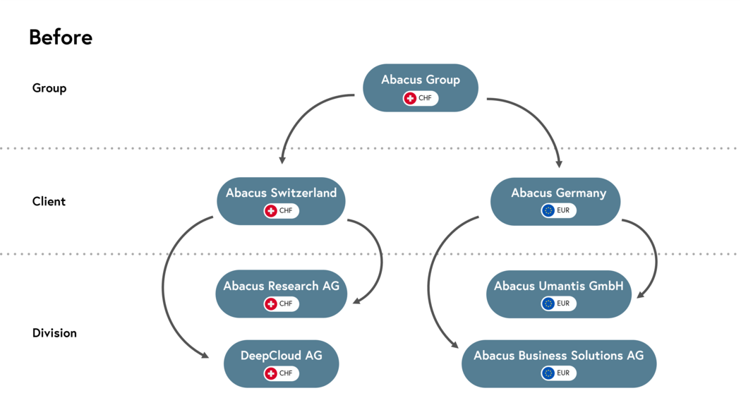 Using the Abacus Group as an example, the initial situation and the presentation of the divisions with Abacus Version 2025 can be visualised as follows: