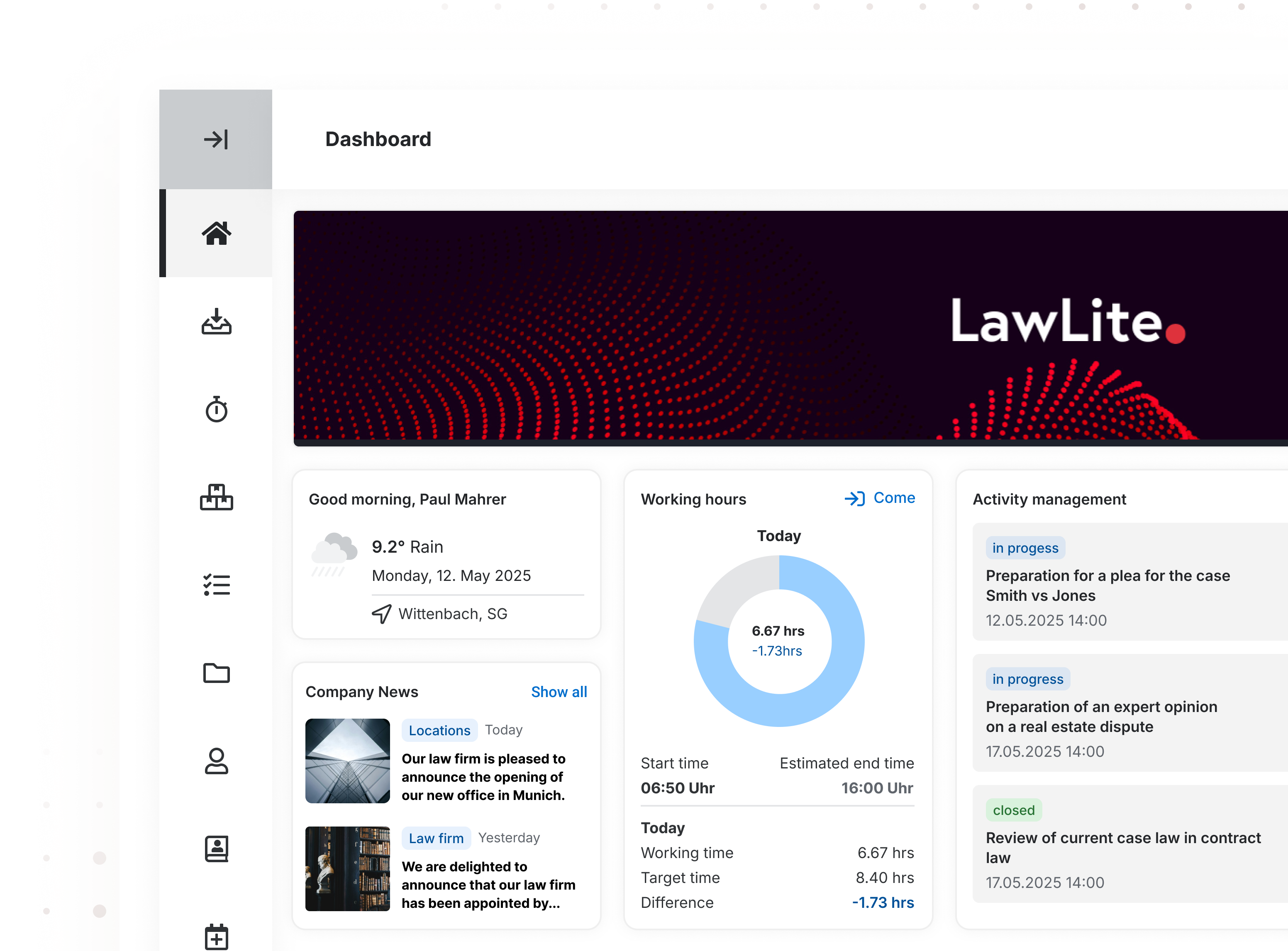 LawLite paves the way into the digital future for innovative small law firms with up to four employees. The standard software, which is tailored to the needs of small law firms, impresses with forward-looking functionalities for a successful day-to-day practice. Immerse yourself in the legal working methods of tomorrow with LawLite - getting started with law firm software has never been easier!