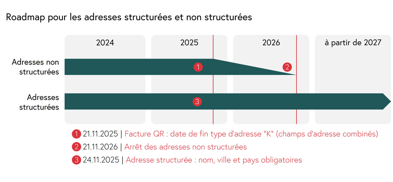 Nous attirons votre attention sur le fait que, lors du paiement, le traitement continu des factures QR avec adresse non structurée ainsi qu'avec adresse structurée sans code postal, ville et pays est garanti au plus tard jusqu'à fin septembre 2026. Le cas échéant, vous devrez fournir de nouvelles factures QR à vos débiteurs.