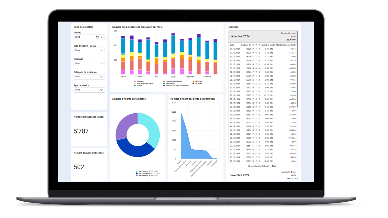 Les dashboards peuvent être partagés de manière ciblée avec différents utilisateurs. L'interface intuitive permet d'explorer rapidement les données, par exemple par période, projet ou entité.