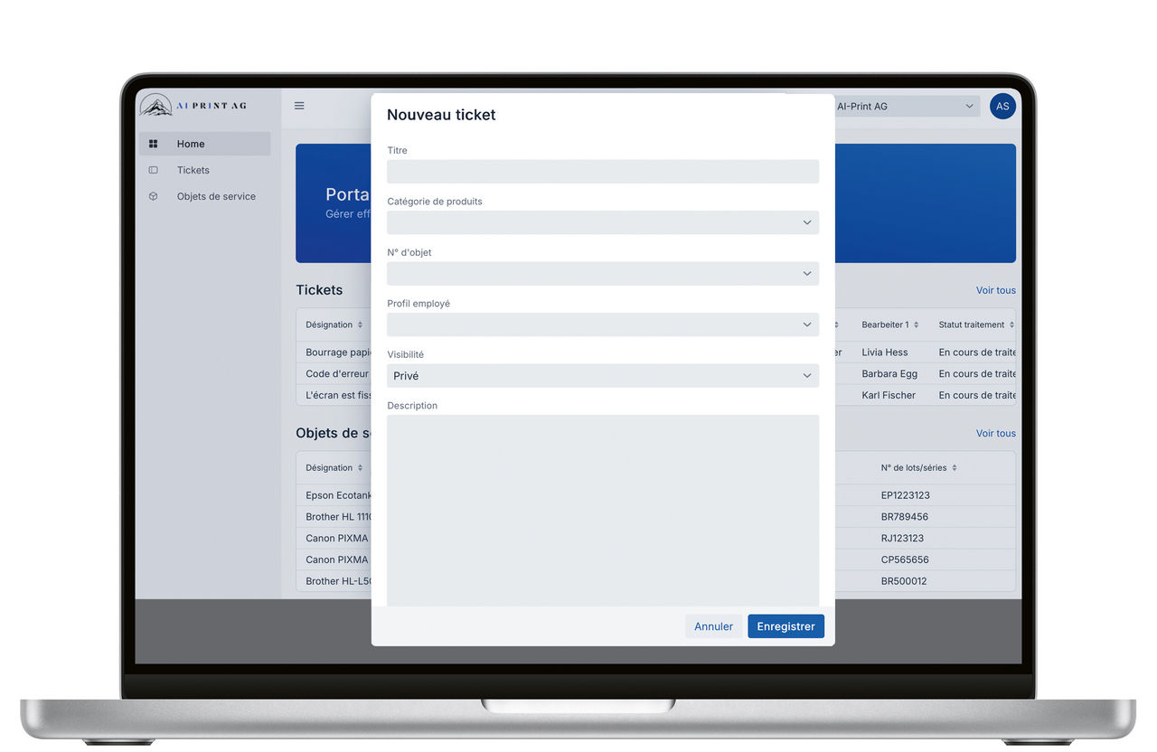 Dans le passé, les demandes de service et de support étaient généralement signalées par e-mail ou par téléphone – ce qui nécessitait à chaque fois une saisie manuelle par le Customer Service. Le nouveau portail Ticketing ouvre un canal de service supplémentaire : les clients saisissent et envoient directement leurs demandes, ce qui élimine les doubles saisies coûteuses. Le Customer Service peut ainsi pleinement se concentrer sur le traitement.