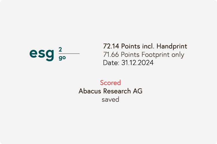 Mit dem Benchmark vergleicht sich die Abacus Research AG mit Firmen aus dem Bereich «Erbringung von Dienstleistungen der Informationstechnologie» an den Sub Scores Umwelt, Soziales und Unterehmensführung. Der Benchmarkwert ist bei 60 von 100 Punkten gesetzt und wird jährlich neu berechnet.