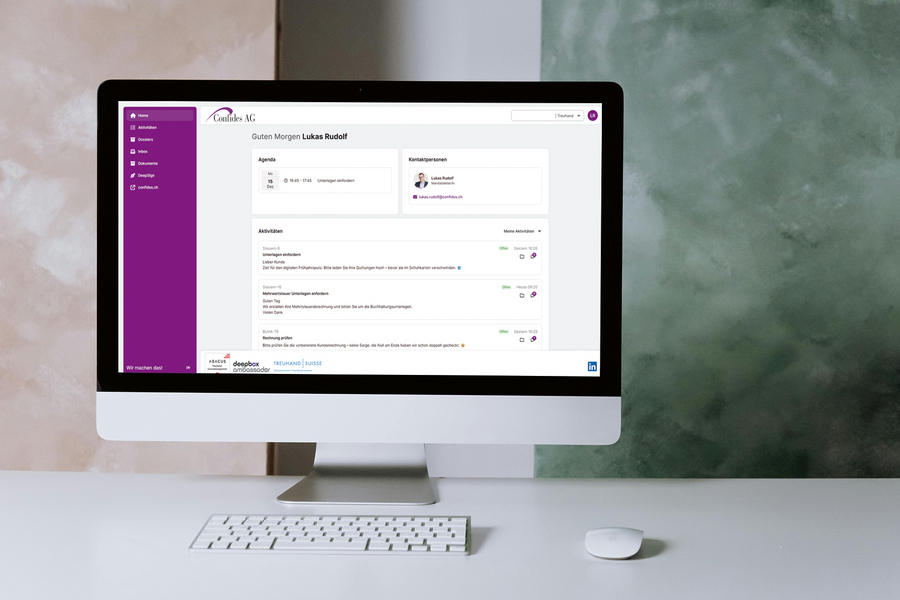 Im Abacus Treuhandportal laufen sämtliche Kommunikations- und Arbeitsprozesse sicher und medienbruchfrei zusammen. Es fungiert als Single Point of Contact und integriert sämtliche Abacus Lösungen wie DeepBox und DeepSign. Informationen und Dokumente lassen sich direkt und sicher aus der Abacus Software heraus im Portal teilen und sind jederzeit und überall aktuell sowie in Echtzeit verfügbar. Durch den integrierten und einheitlichen Kommunikationskanal werden sämtliche Informationen, Dokumente und Unterhaltungen zwischen Treuhandunternehmen und Kundinnen und Kunden sauber und nachvollziehbar im Abacus System dokumentiert – inklusive der lückenlosen Nachverfolgung von Fristen und Aufgaben.