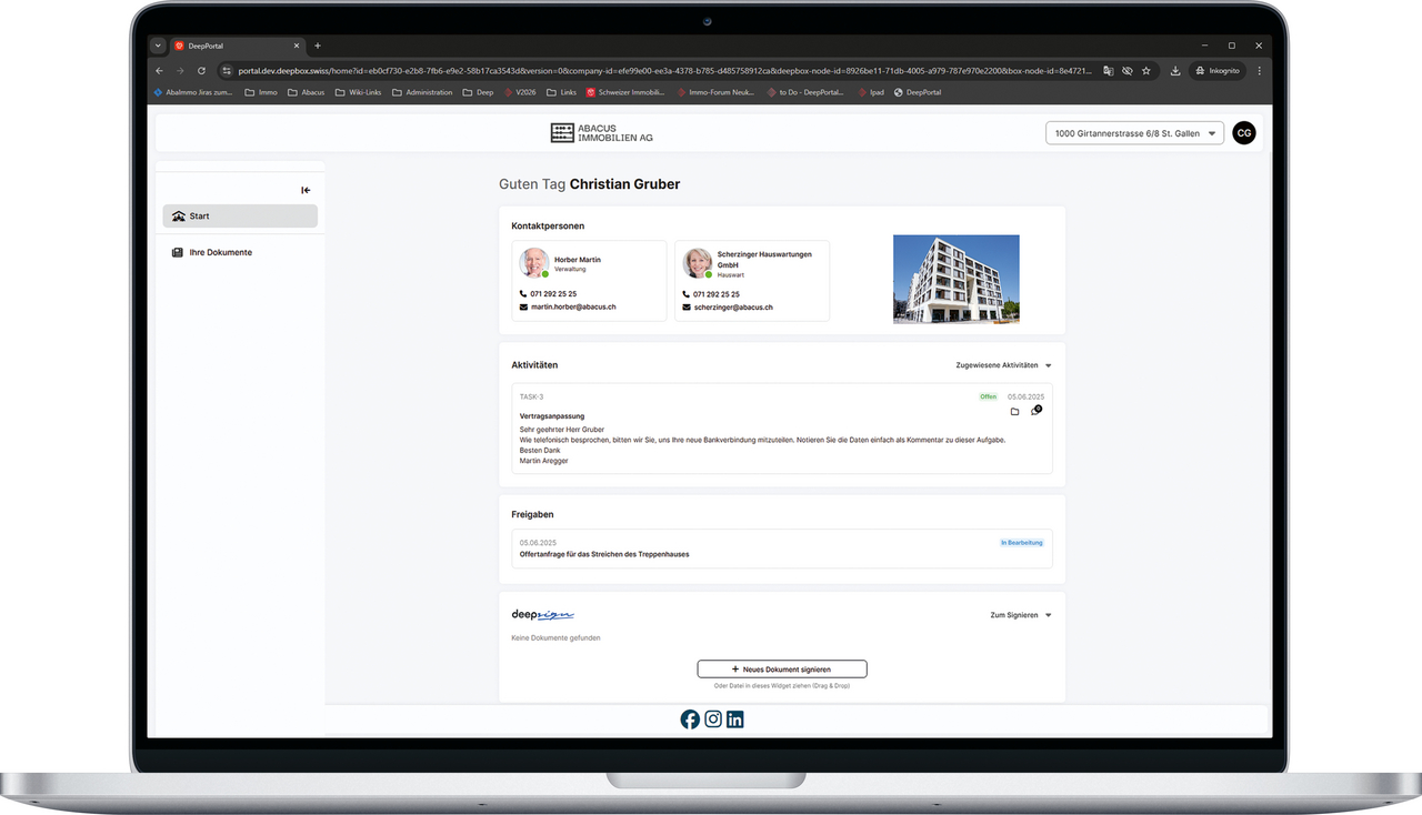 Ein mit dem ERP verbundenes Eigentümerportal fungiert als zentrale Schnittstelle zwischen Verwaltung und Eigentümern. Durch die direkte Anbindung an AbaImmo werden sämtliche Daten und Dokumente in Echtzeit synchronisiert und bereitgestellt. Eigentümer profitieren so von einer stets aktuellen, konsolidierten Übersicht über ihre Immobilienportfolios. Die intuitiven Dashboards bieten einen schnellen Überblick über relevante Kennzahlen, beispielsweise zu Leerstandsquoten, offenen Posten, Unterhaltsmassnahmen oder anstehenden Investitionen. Freigaben für Bestellungen oder grössere Massnahmen können direkt im Portal erteilt werden. Dadurch werden Entscheidungsprozesse beschleunigt und eine lückenlose Dokumentation aller Vorgänge wird gewährleistet. Ein weiterer zentraler Vorteil liegt in der optimierten Kommunikation: Anfragen können digital und strukturiert abgewickelt werden, Dokumente sind jederzeit abrufbar und downloadbar. Das reduziert Rückfragen, verkürzt Bearbeitungszeiten und schafft eine transparente Informationsbasis für alle Beteiligten. Auch die Verwaltung profitiert. Die papierlose Zustellung von Unterlagen spart Aufwand und Kosten und hilft, den Fachkräftemangel in der Immobilienverwaltung abzufedern. Bei neuen Informationen oder Dokumenten werden Eigentümer automatisch per E-Mail benachrichtigt und bleiben so immer auf dem aktuellen Stand.